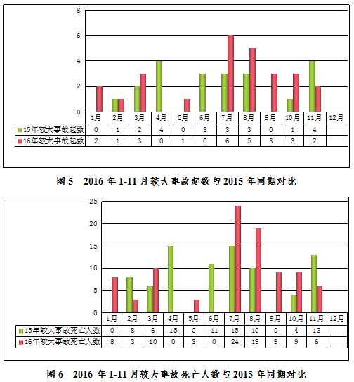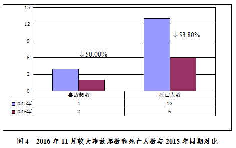 2016年11月,全國共發(fā)生房屋市政工程生產(chǎn)安全較大事故2起、死亡6人,比去年同期事故起數(shù)減少2起、死亡人數(shù)減少7人,同比分別下降50.00%和53.80%(見圖4)。