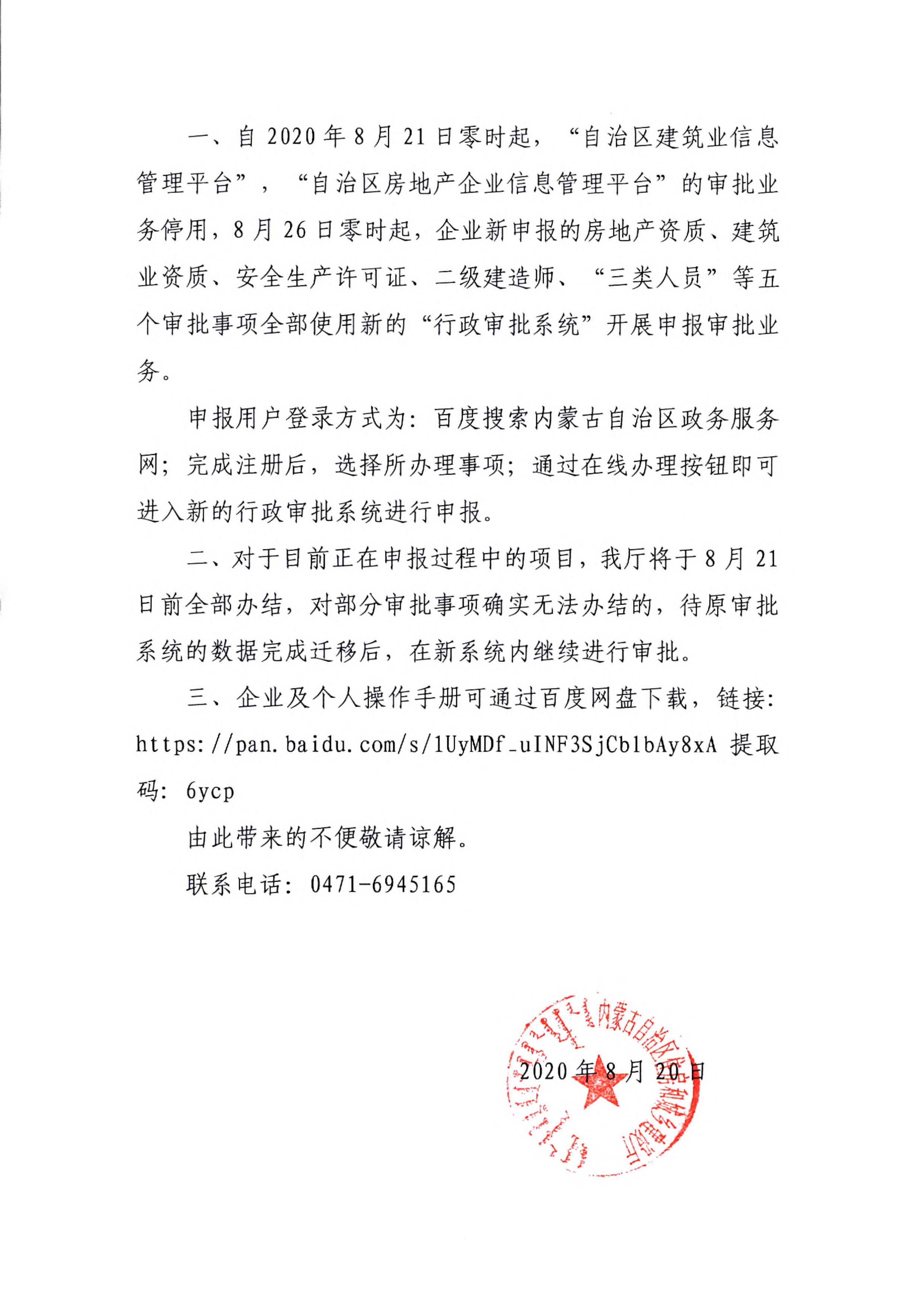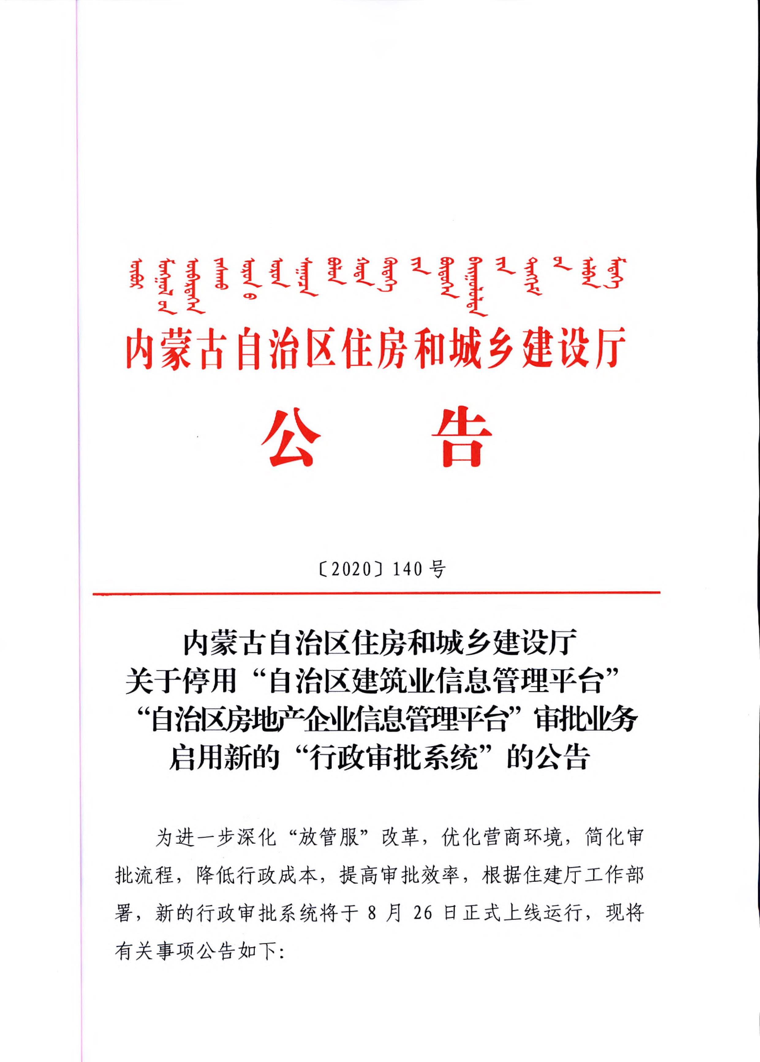 內(nèi)蒙古自治區(qū)住房和城鄉(xiāng)建設(shè)廳關(guān)于停用“自治區(qū)建筑業(yè)信息管理平臺(tái)”“自治區(qū)房地產(chǎn)企業(yè)信息管理平臺(tái)”審批業(yè)務(wù)啟用新的“行政審批系統(tǒng)”的公告