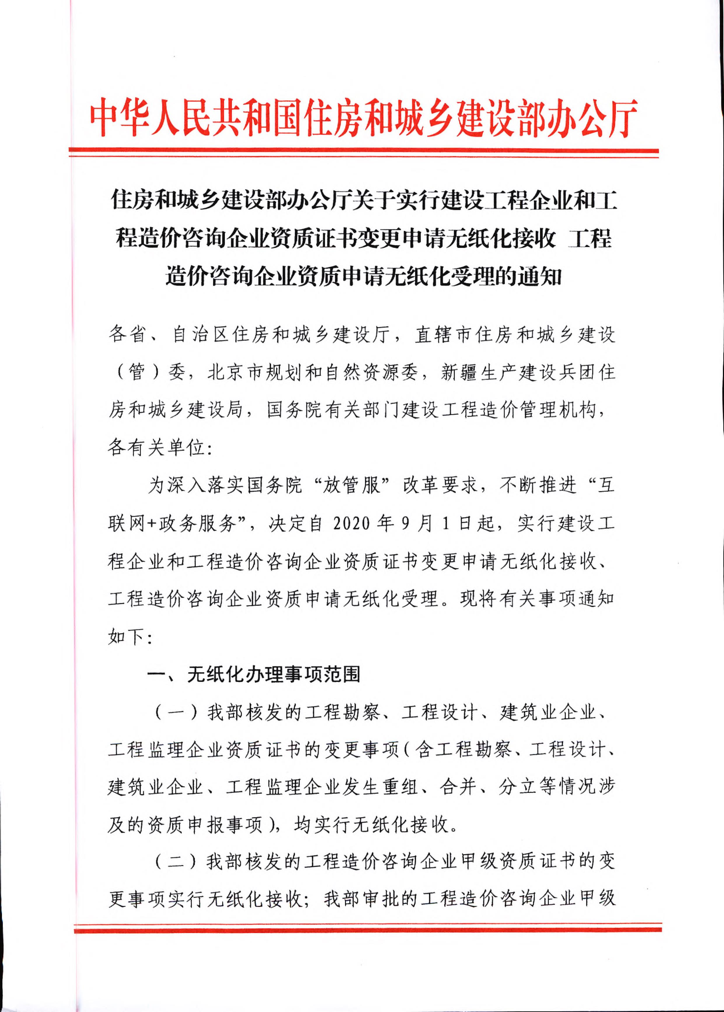 住房和城鄉(xiāng)建設部辦公廳關于實行建設工程企業(yè)和工程造價咨詢企業(yè)資質證書變更申請無紙化接收 工程造價咨詢企業(yè)資質申請無紙化受理的通知