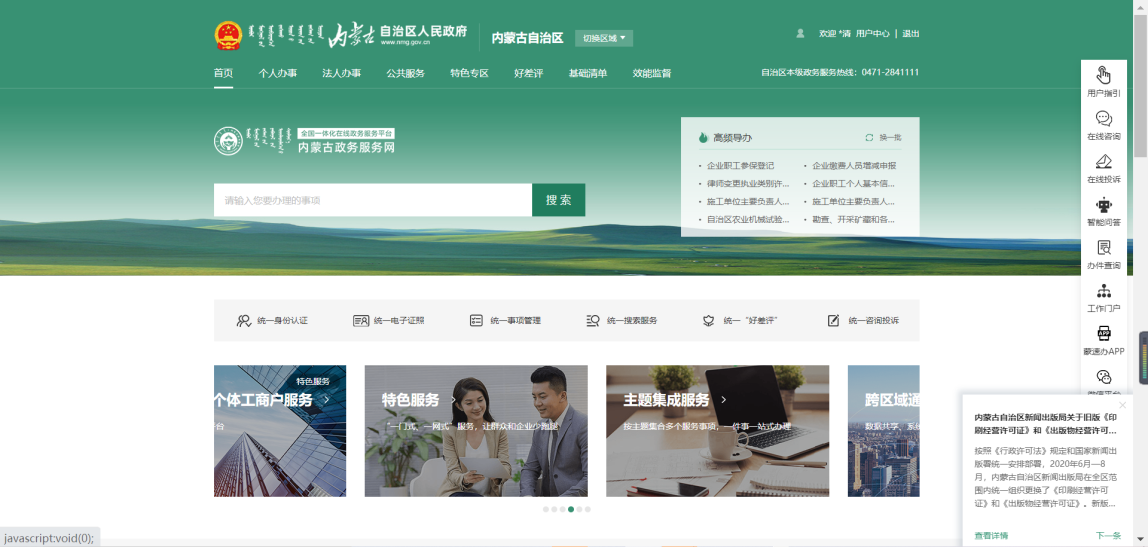 自治區(qū)住建領(lǐng)域電子證照系統(tǒng)是基于自治區(qū)政務(wù)服務(wù)網(wǎng)的功能使用的,需要對(duì)電子證照查詢(xún)及打印使用的用戶(hù)首先登陸政務(wù)服務(wù)網(wǎng);