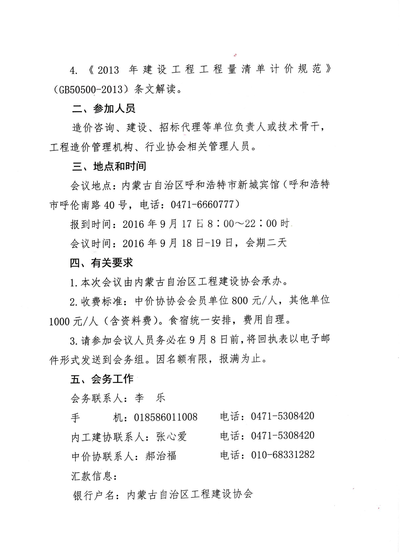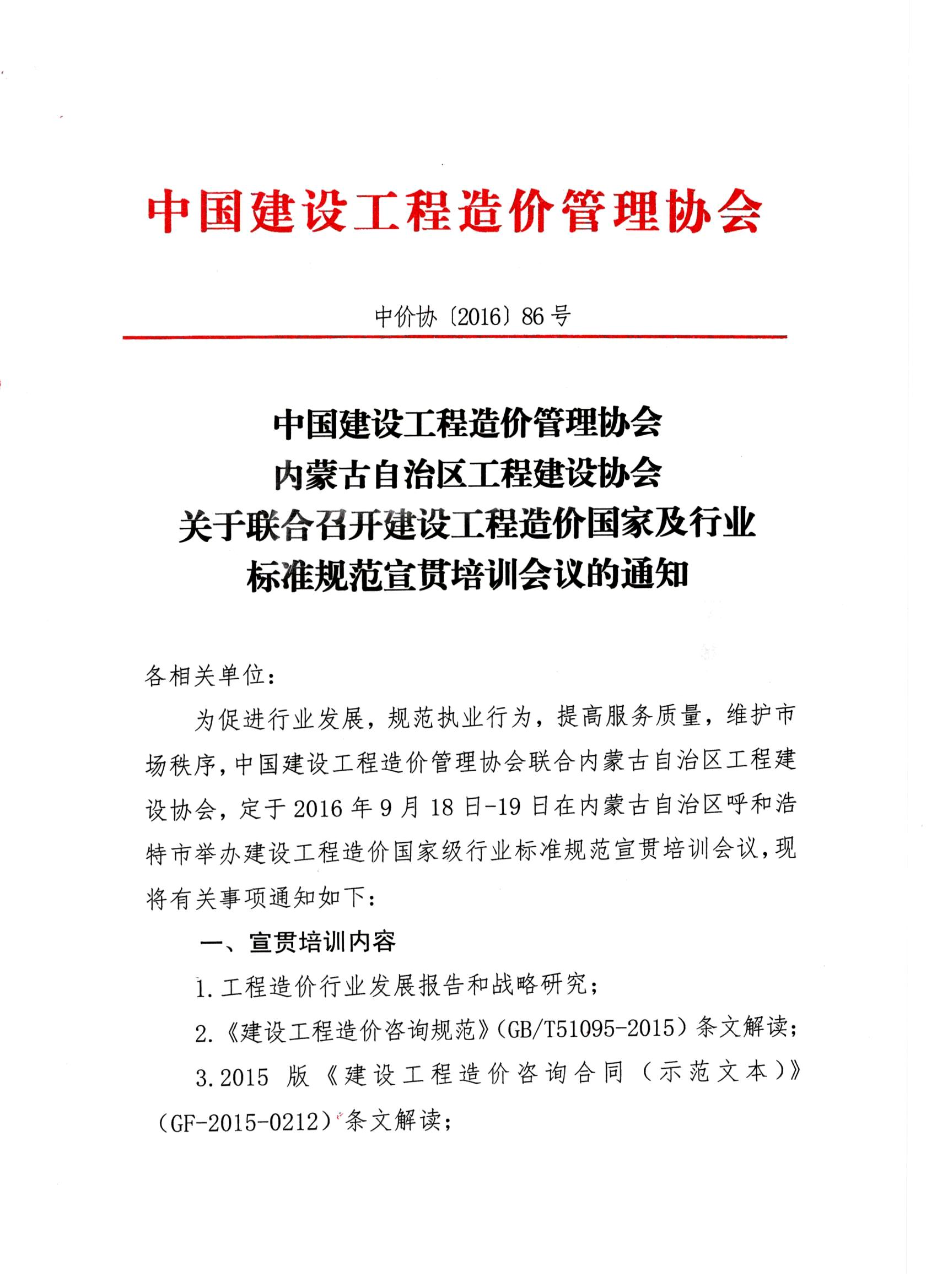 中國(guó)建設(shè)工程造價(jià)管理協(xié)會(huì) 內(nèi)蒙古自治區(qū)工程建設(shè)協(xié)會(huì) 關(guān)于聯(lián)合召開建設(shè)工程造價(jià)國(guó)家及行業(yè) 標(biāo)準(zhǔn)規(guī)范宣貫培訓(xùn)會(huì)議的通知